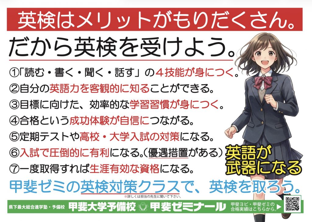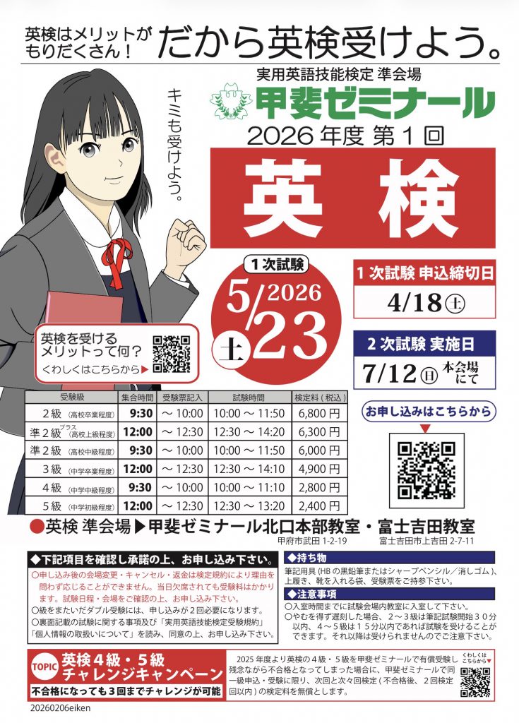 🌏 2026年は英検にチャレンジ 入試のために、将来のために、今年はみんなで英検に挑戦だ。申し込みは今すぐ! Screenshot Screenshot Screenshot 共有:TwitterFacebook
