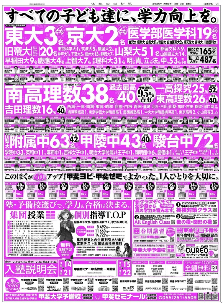 甲府南理数科12名(定員12名)甲府一探究科10名(定員18名)吉田理数科5名(定員6名)甲府東理数コース4名(定員6名)過去最高の成果となりました。なお、甲府南理数科の「完全試合」は5年ぶり2度目の偉業です。さあ、先輩の背中を追いかけましょう。