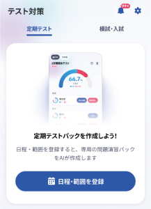 テスト範囲を撮影すると、AIが該当分野を分析し、弱点克服に必要なコンテンツを自動生成するので、効率良く対策できます。範囲や単元を選択して作成することもでき、AI診断の結果をもとに、その時点での実力に合わせた問題が優先的に出題されます。